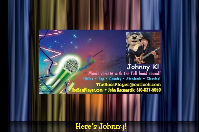 Johnny K He has worked with Nicole Donatone, The Cramer Brothers Band, Donna Parsons, Phoenix and with Tom Kozic & Carl Hittner He also has worked with Cookin', Partytime, CMA Horizon Award winner Karen Taylor Good, Jerry Jaye, hit recording Artist Lenny Welch, Late Nite Rodeo, Ronnie Rinard & The Shadows and The Sounds of Nashville. John has also written many songs, some alone but most with good friend and musical genius Craig Kastelnik of KATO. Recording is also a part of John's career and he has recorded on a CD project for Tom Kozic and also on a demo project for Brittany at The Menagerie Recording Studio in Saylorsburg, PA. Recorded at DAN'S HOUSE STUDIO a few times with Steve Brosky. (Demo, Get Ready project & Chronicles) There's also 'New Groove' CD! Tracy Unangst at Pete Helffrich Recording Labs back in the 1980's. What may surprise many people is that John's favorite singer and artist of all time is Frank Sinatra! He has seen Frank in person 18+ times and has been collecting Sinatra memorabilia since the 1970's!